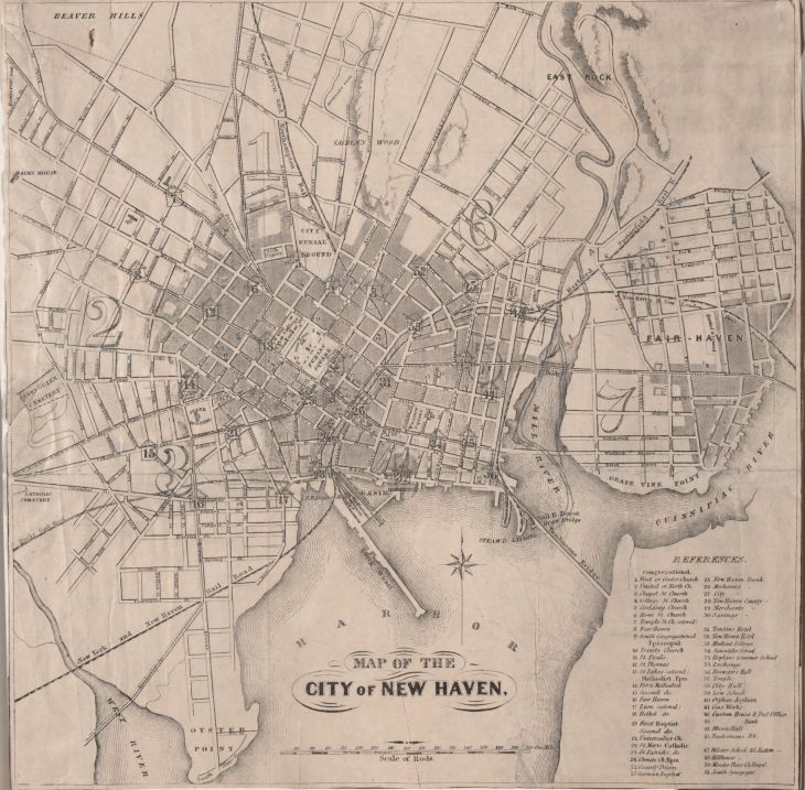 Image: Unknown artist, Map of the City of New Haven, 19th century. Lithograph, sheet: 12 1/2 x 12 5/8 in. (31.7 x 32 cm). Yale University Art Gallery, 1987.1.36.