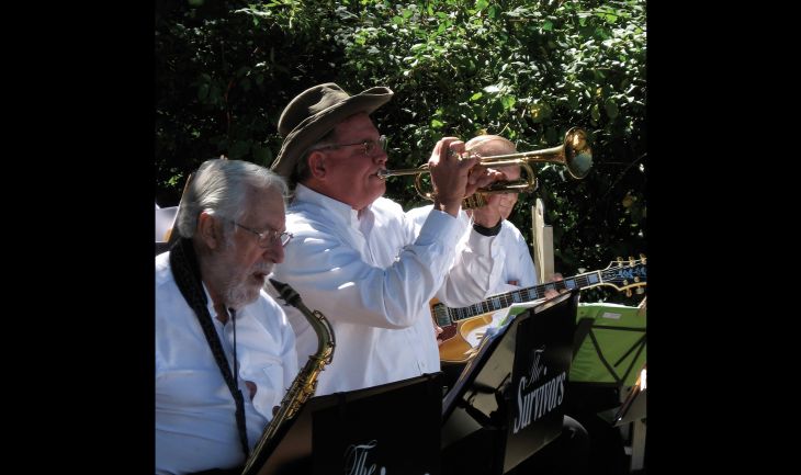 A seven-piece jazz band playing the classics of a bygone era: piano, guitar, banjo, soprano, alto, tenor and baritone saxes, clarinet, trumpet, cornet and baritone horn, string bass, drums and a vocalist.